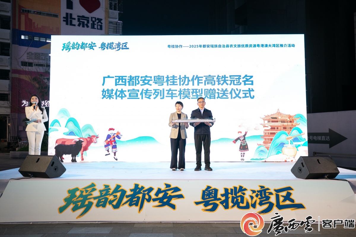 此外,现场还举行了“广西都安粤桂协做高铁冠名宣传列车模子赠送典礼”。据引见,为激活都安文旅财产高质量成长,本年都安县启动优良农文旅资本进高铁勾当,通过投放高铁列车冠名告白,使用多宣传擦亮都安文旅品牌,进一步开辟了都安文旅财产链接湾区的渠道。